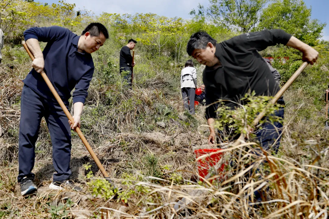 4月12日上午,在河南信阳淮河上游天目山退化林补植修复项目现场,集团公司党委书记、董事长、总经理单忠立,党委委员、副总经理李留彬,信阳市委常委、副市长李俊和大家三五一组,手持铁锹、水桶等工具来到植树区域,挥锹刨坑、扶苗培土、提水浇灌、平整踩实……大家悉心栽种着黑松、麻栎等苗木,现场一派热火朝天的景象。经过一个多小时的辛勤劳动,一株株“新生”的苗木“安家落户”,在微风吹拂下,焕发出勃勃生机。