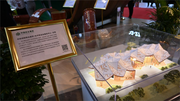 展会上,中林集团聚焦“科学扩绿 为国储材”“创新引领‘双碳’先行”“美丽中国 乡村振兴”“生态产品价值实现”“绿水青山就是金山银山”五大主题,集中展现了中林集团“落实森林‘四库’建设美丽中国”的丰硕成果,展厅面积近500平米,吸引了众多参观者和行业人士的关注。从杭州亚运会亚运村服务中心空降至展厅中心的木结构建筑“云桂”更是成为现场的“明星”展品,吸引了众多参观者驻足观看并拍照留念。