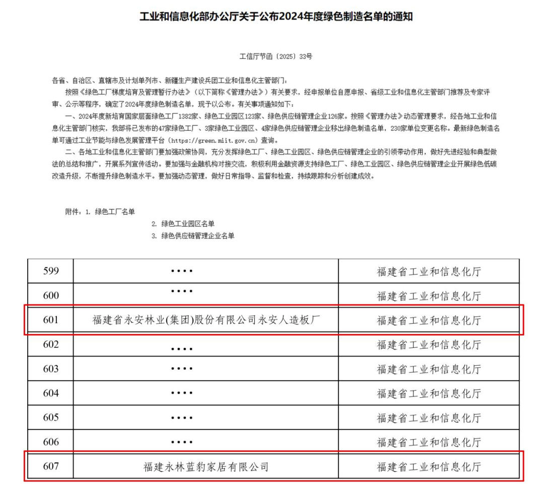 近日,国家工信部正式公布了2024年度绿色制造名单,中林永安林业旗下永安人造板厂和福建永林蓝豹家居有限公司双双荣获“国家级绿色工厂”认证,这是继两厂在荣获“省级绿色工厂”认证后,获得的又一极具含金量的国家级荣誉,标志着永安林业在绿色发展道路上迈出了更加坚实的步伐。