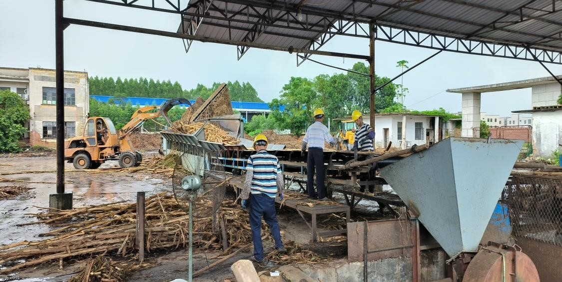国庆假期,中林雷林工业有限公司工人坚守岗位,开展木材去皮切片工作。